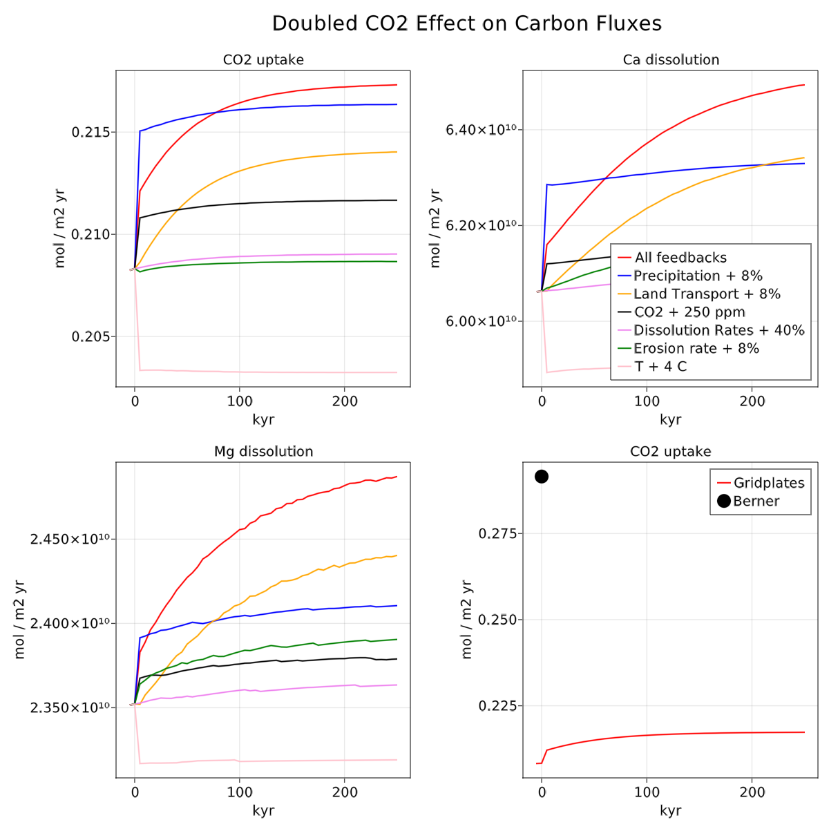 The steady state takes millions of years to achieve and is not necessarily relevant to a short-term perturbation, but it is the way to start to understand the model. CO2 uptake rates are limited by availability of source rock, not CO2 concentration or many of the other model parameters. In particular, the erosion rate is taken as a pre-exponential multiplier and an e-folding depth scale parameter, neither of which has much impact on CO2 uptake rates, because the thickness of the regolith cell in an eroding grid point responds quickly and adjusts to the dynamics of the system, which is regulated ultimately by the regoith tranport parameter.