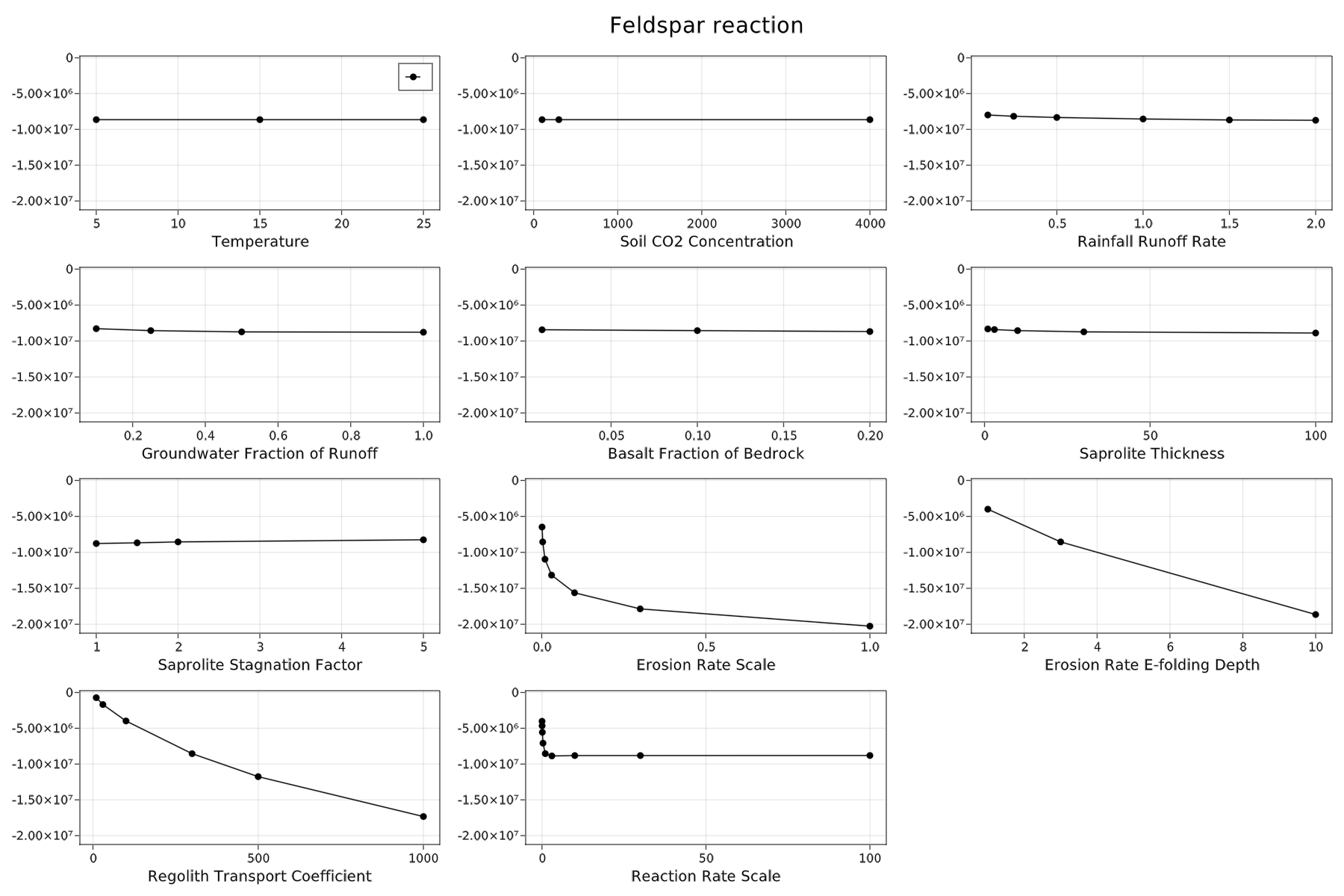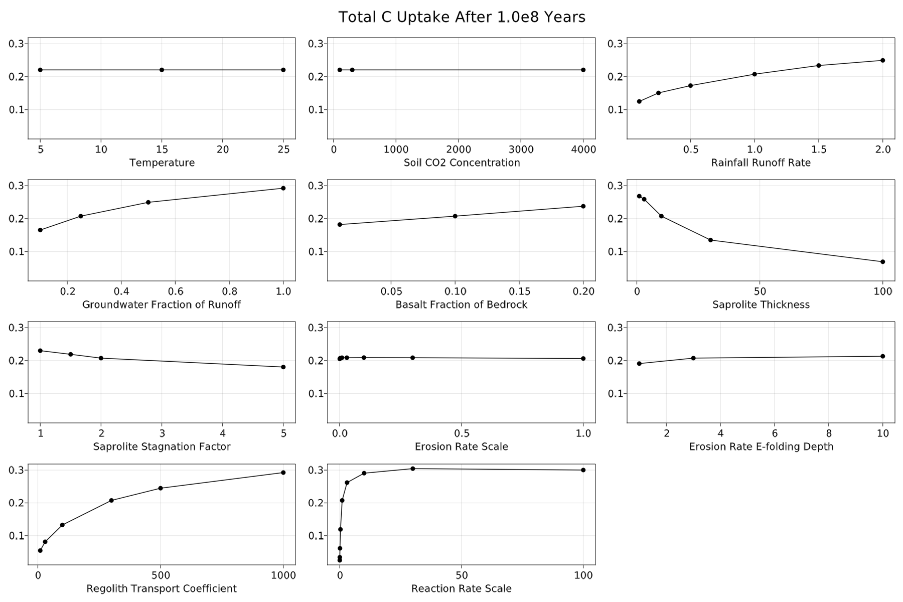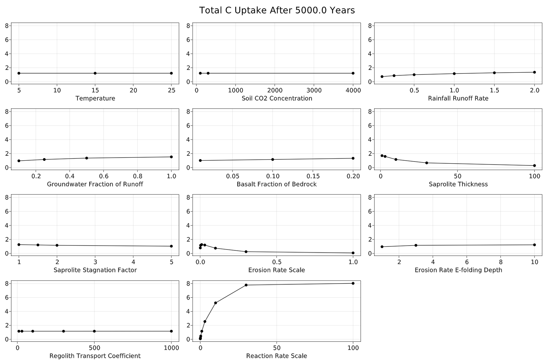 For reference, here are the sensitivity of end-states to runoff rate, groundwater fraction of runoff, basalt fraction of bedrock, saprolite thickness, saprolite fluid stagnation parameter, erosion rate parameter, erosion rate 1/e dropoff depth, regolith transport parameter, and the reaction rate scale parameter.